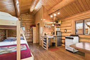 Studio • 1 Bathroom 1 Bath • Sleeps 1-6The Kenai Kuik Cabins community boasts 110’ of private riverfront property! Beginners and avid anglers alike will love casting lines from the fishing dock. Steps provide easy river access. Grill to perfection on the charcoal grills under the covered picnic area and enjoy a nice bonfire with plenty of wood for smore’ gatherings. Shared washers and dryers are available free of charge in a communal area. This rental is one of five adjacent cabins in the Kenai Kuik Cabins community. If traveling with a larger group, consider renting one of the next-door units as well.