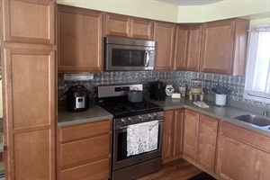 The fully stocked kitchen has everything you need to prepare meals, with dining space for gathering and sharing stories from the day’s adventures. A washer and dryer add extra convenience for longer stays.