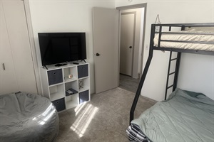 4 Bedrooms • 2 Bathrooms 2 Baths • Sleeps 1-10Inside, the home comfortably accommodates up to 10 guests with four bedrooms and two bathrooms, making it ideal for families or groups. Thoughtful sleeping arrangements include a queen bedroom and multiple bunk rooms, plus an additional queen bed in a nearby dry cabin for extra flexibility. The spacious living area features a large couch, recliners, and a TV—perfect for unwinding after a day outdoors.
